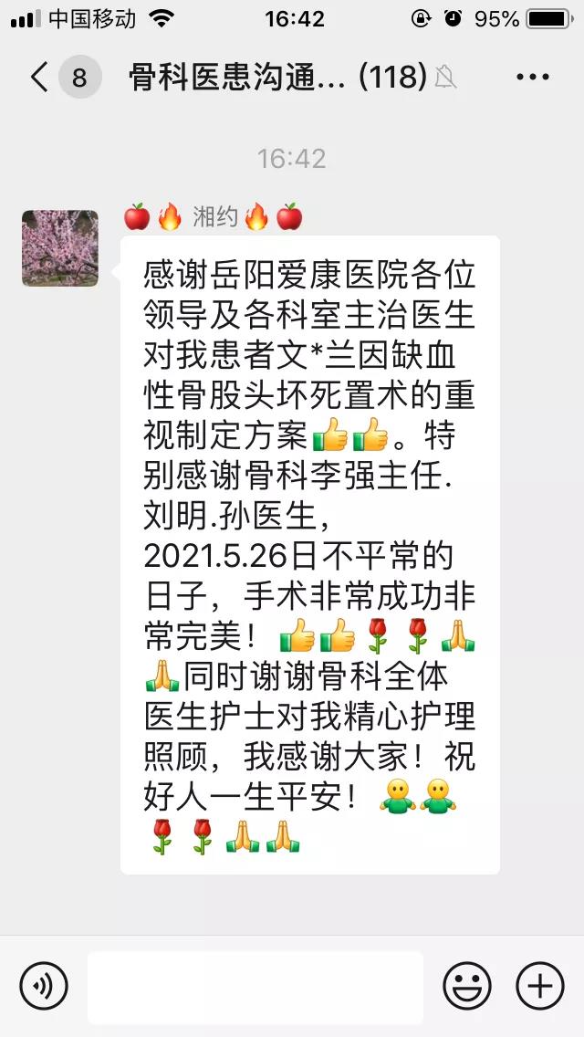 “手術(shù)非常成功非常完美!感謝骨科全體醫(yī)生、護士,你們就像我的家人一樣待我好,我來愛康真是來對地方了!不但實現(xiàn)了我甩掉雙拐的愿望,讓我終于可以“挺直腰桿”了!還讓我感受到與其他醫(yī)院的不同,原來在醫(yī)院也可以享受親人般的關(guān)懷,很溫暖.......”文娭毑發(fā)自內(nèi)心的說道,手術(shù)完成的當(dāng)晚文娭毑便在骨科醫(yī)患溝通群內(nèi)發(fā)出感謝的話語。